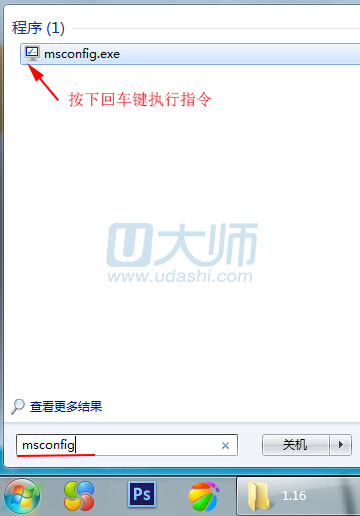 1.在桌面点击左下方“开始”按钮,然后在菜单栏的搜索框中输入“msconfig”指令,直接按回车键执行指令: