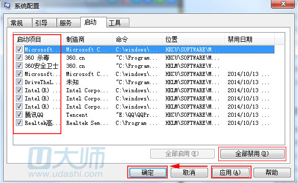 3.接着把这些开机启动项全部勾选,然后点击“全部禁用”,点击“应用-确定”: