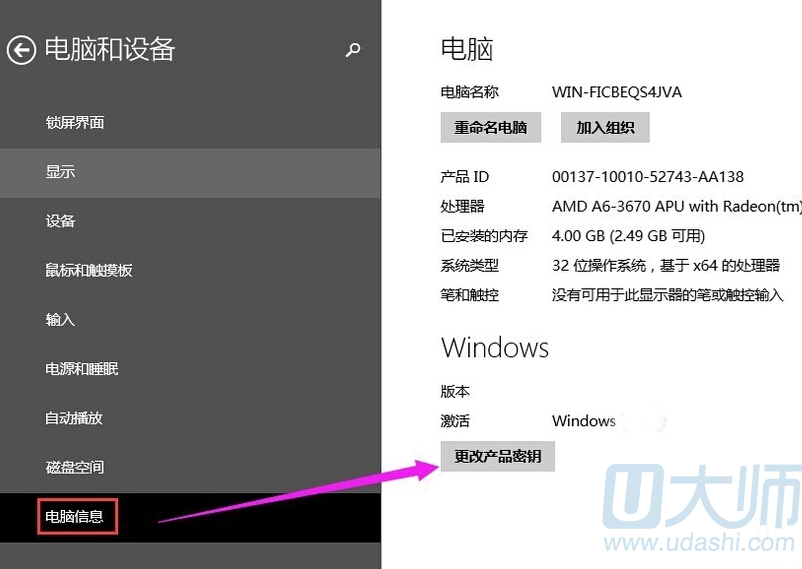 3.电脑信息右边就可以看到更改产品密钥: