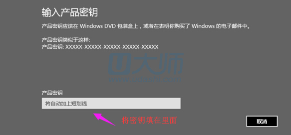 4.手打输入产品密钥,不能复制粘贴。然后就会自动验证密钥是否正确(微软官方有给出产品密钥)。若果正确则会自动激活。