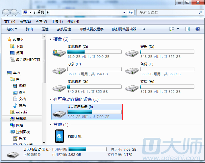 1.将u盘插入usb接口,等待计算机中出现u盘图标: