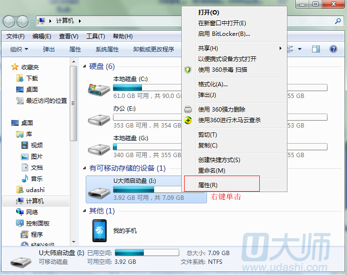 2.右键单击u盘图标,在弹出的菜单栏选择“属性”选项: