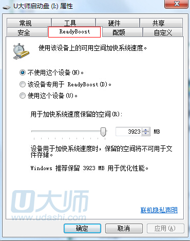 3.在弹出属性窗口中,按下“ReadyBoost”标签: