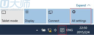 在Windows 10任务栏右下角点击“通知”按钮,然后点击“All settings”(所有设置)打开系统设置: