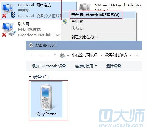 3.在设置界面点击“设备”->“蓝牙”,把蓝牙和iPhone配对,iPhone和电脑都要“确定”配对,配对成功后电脑会显示已连接。同时按下Win + X打开管理菜单,接着按W键打开“网络连接”,在名称为“Bluetooth 网络连接”的网卡上点击右键,选择“查看 Bluetooth 网络设备”打开“设备和打印机”界面,在iPhone设备图标上右键点击选择连接。