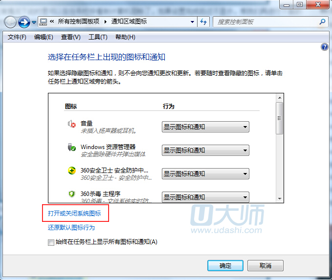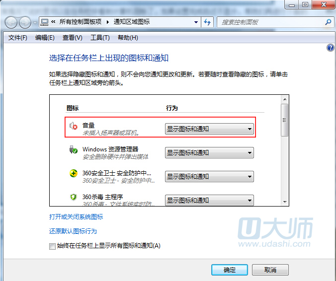 2.在通知区域图标参数设置中,在图标处找到喇叭图标,将行为改为“显示图标和通知”,然后点击“确定”按钮: