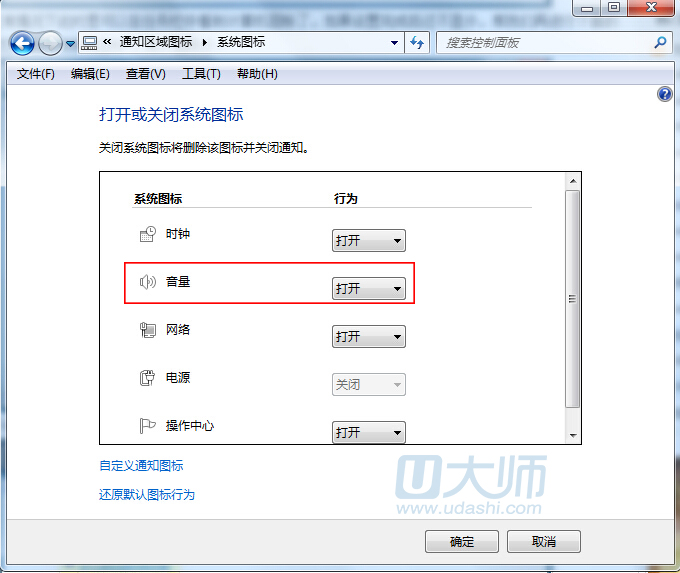 4.打开系统图标设置界面,将音量的系统图标改为“打开”,后点击“确定”按钮: