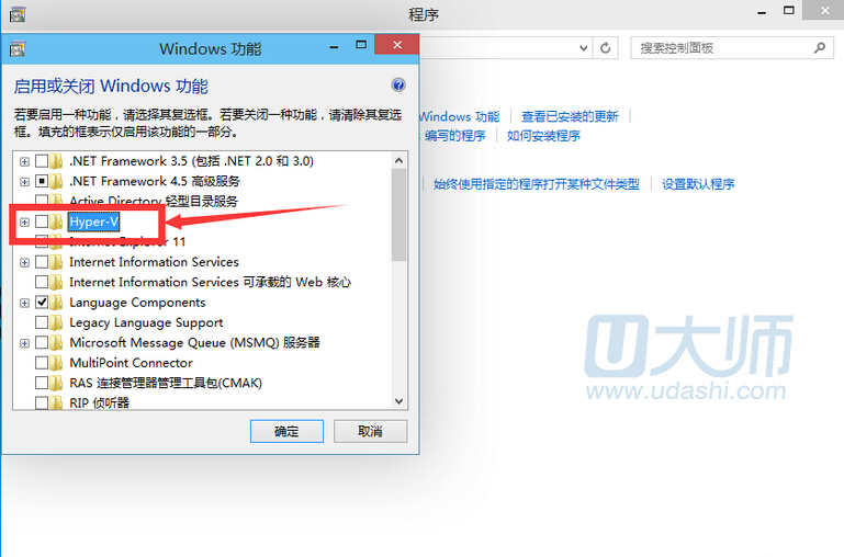 4.在windows功能下面找到“Hyper-V”,将其勾选,后点击“确定: