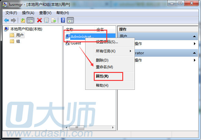 3)在窗口中间栏显示的用户名称中,找到当前用户,鼠标右键点击,选择“属性”,如下图所示: