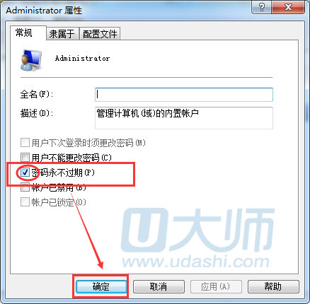4)在弹出的属性窗口中选择勾选“密码永不过期”,在选择“确定”,就大功告成了,如下图所示: