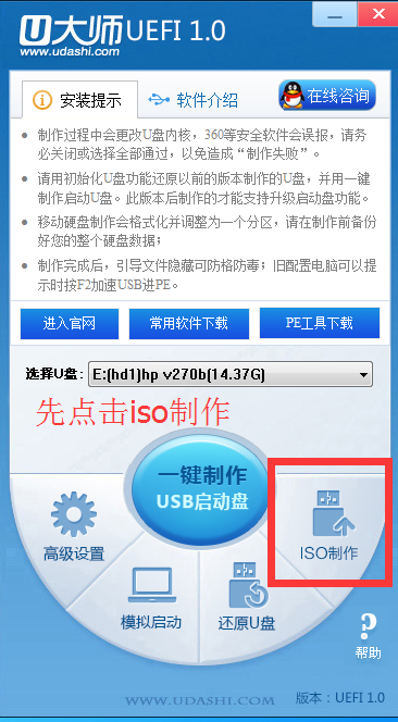 第二步,点击一键制作,选定我们刚刚制作出来的iso文件,一般名字都是UDashi.ISO;