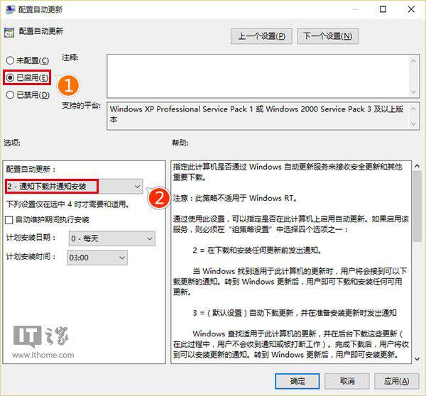 3、 在右侧双击“配置自动更新”,然后选择“已启用”,在左下方下拉菜单中选择“2 - 通知下载并通知安装”后点击“确定”