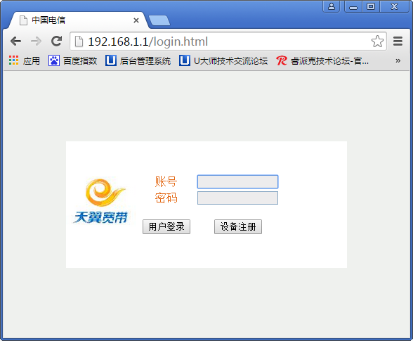 1. 首先我们要设置wifi上网,就必须先要进入光猫中进行设置,打开浏览器,输入192.168.1.1,回车,进入如下界面: