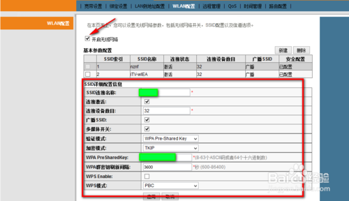 5. 接着在SSID详细配置信息界面中输入你需要的ssid名称(就是你无线wifi的名称),并且在连接激活后面的方框打上勾——保证设置完毕后能够启用。其中设备连接数目就是你想叫这个无线wifi能够有几台设备链接,可以自行设置。在广播ssid后面的方框也打上勾——保证你能够搜到这个ssid;至于加密方式可以默认或者自己选择比较牢靠的方式,然后输入自己的面点击应用。