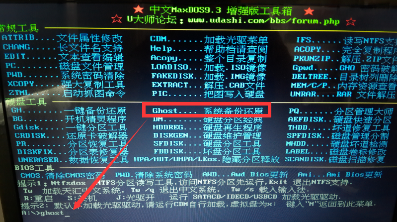 选择之后我们会进入一个画面,直接回车或者等几秒就能进入主菜单,这里我们会看到很多工具,对照前面的代码,我们将代码敲入,就可以运行,比如ghost