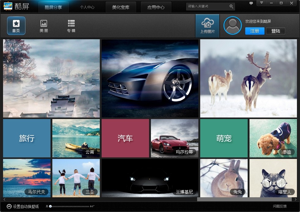 酷屏是一款免费桌面美化资源管理应用软件。酷屏主要栏目有:酷屏壁纸下载、桌面主题下载和桌面应用。软件拥有海量的XP电脑 主题、Win7主题、桌面壁纸、电脑登陆界面、鼠标指针、桌面屏保、文件夹图标等桌面美化资源。美好的画面带给你美丽的心情!