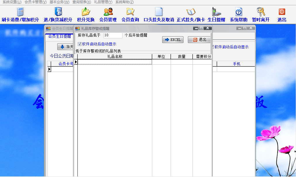 10、简单完善明了的会员生日/流失客户提醒界面,该界面一目了然,启动后,自动显示3天或5天后过生日的会员信息;同时还可以查阅超过几个月未在本店消费的会员信息。以便给会员发信息等等。