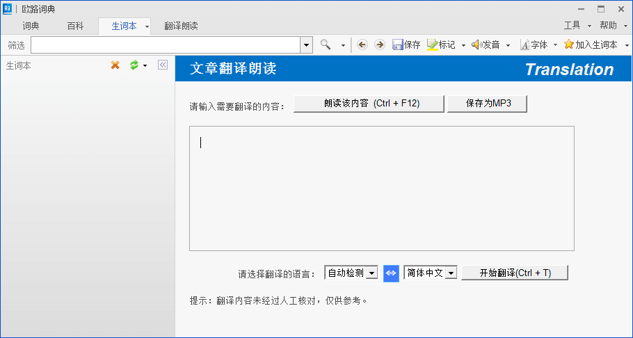 欧路词典是一款支持海量扩充词库、海量词库丰富词典。内置常用英汉词条30多万个,专业词条40万个,支持加载MDict、灵格斯、Babylon等多种词典格式。可以打开众多网友制作的大量精美词典库。支持百度、有道、American Heitage等多部在线词典。提供免费词库编辑器,自行制作导入Windows系统中的词库、生词本多平台同步。一键同步生词本、笔记、学习记录。
