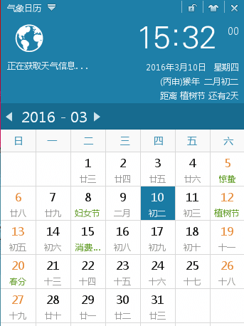 气象日历是一款具有强大天气预报功能的桌面日历工具,该软件绿色安全、无捆绑、体积小,提供常用日历查询以及近七天的天气预报,支持万年历查询,是一款非常简单、好用的桌面日历工具。可以很简单的了解天气情况哦!