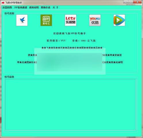 飞扬VIP账号助手是一款专门用于免费获取网络视频播放器的会员账号的工具,现在互联网上有非常多的视频资源,但是都需要使用该视频平台的会员才能使用,使用飞扬VIP账号助手就能让你免费拥有这些平台的会员账号了。