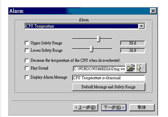 下拉列表中提供了对CPU,主板,等等的报警对象,您可设置无限多的报警选项,但比较实用的是CPU,主板等的温度报警设置。直接选择就行了。