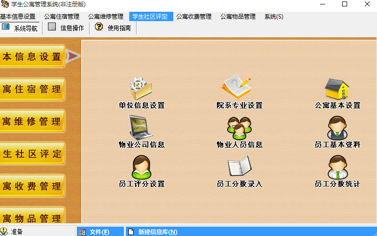 基本信息设置:单位信息设置、院系专业设置、公寓基本设置、物业公司信息、物业人员信息、员工信息管理等