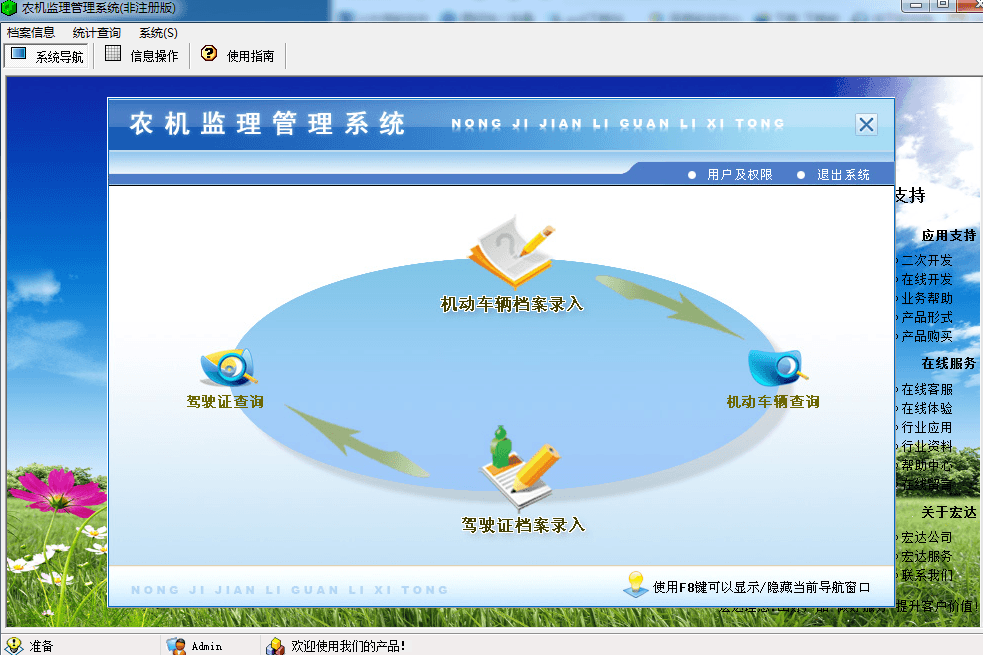 宏达农机监理管理系统是一款非常好用的宏达农机监理管理工具,软件的主界面共有档案信息、统计查询、系统三大功能菜单,下方还有系统导航、信息操作、使用指南三个操作窗口,功能非常丰富,操作简单,是一个实用的管理系统。