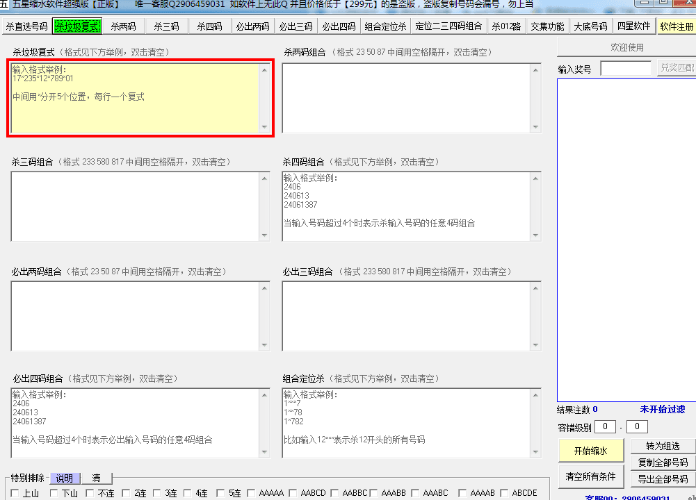 五星缩水软件超强版是一款非常实用的彩票缩水工具,软件主界面有杀直选号码、杀垃圾复式、杀两码、杀三码等菜单。软件界面比较复杂,也许对喜欢玩彩票的人来说很正常,软件内每个小版块都有使用说明,方便使用。