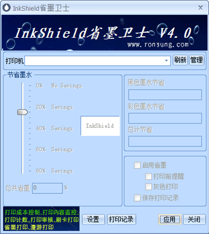 省墨卫士(InkShield)是一款简单实用的打印省墨软件,运用先进的数学算法及像素优化技术,采用独创的省墨打印技术,实现真正的绿色低碳环保打印,平均节省50%以上的打印成本。