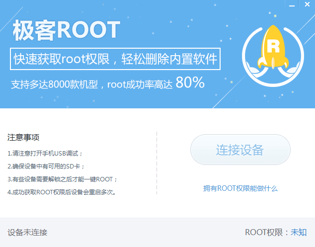 极客Root是一款功能强大、操作简单的手机root工具,全面兼容各种安卓手机主流机型,支持一键root操作,能够帮助用户快速获取root权限,删除内置文件,目前支持八千多款机型,root成功率极高。