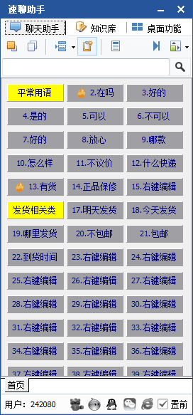 速聊助手是一款能够让你更加方便进行在线聊天的软件,现在在网上开设有网上店铺的用户是非常多,为了方便淘友进行商品的选购一般都是会设置在线客服的。为了让您的客服能更加方便的了解店铺的商品,您可以通过速聊助手进行快速的聊天,能让你的更加方便的进行回复。