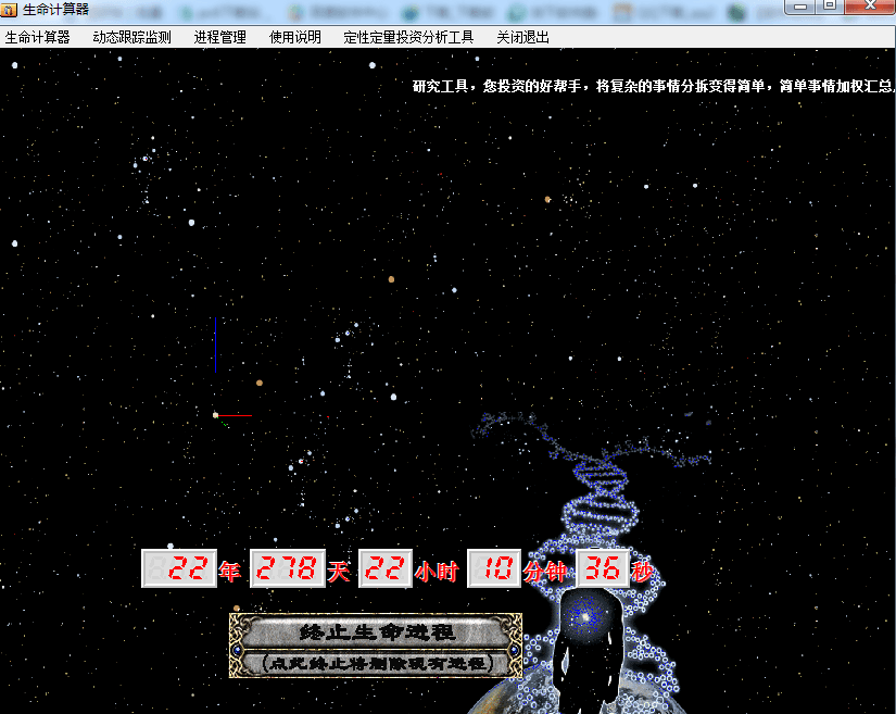 生命计算器是一个用于计算生命时长的软件,绿色小巧,使用方便。这款评估寿命及健康状况的小工具,源自美国波士顿大学医学院Thomas Perls博士建立的寿命预测模型,它曾受到过美国《时代周刊》和CNN的热捧。测试过程的每个选项都经过了严格的专业评测,基于大量实验结果而设置。