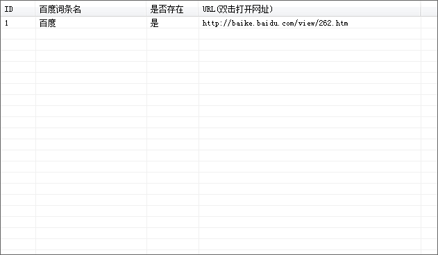 Your百度词条批量查询器是一款专门用来查询报读词条是否真正存在的实用软件,操作简单,只需要添加关键词,即可显示与关键词相关的词条是否存在,如若存在,则会显示词条的URL链接地址,双击链接即可打开词条的百度地址,欢迎下载体验。