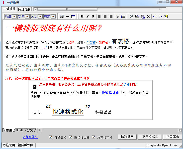 一键排版是一款简单实用的文章内容排版工具,可以将错乱复杂的图文混合的文章进行格式化批处理,同时能有效删除文章内容中的样式和链接,使文章通过一键处理即可变得干净、规范,对于那些篇幅较长而又需要统一格式的图文或者网站工作者来说确实特别方便。