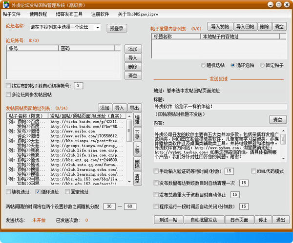4.支持批量导入论坛帐号自动切换,软件支持批量导入论坛帖子地址和帖子内容。分别有随机、顺序、循环或固定发布选项,可组成18不同组合来发布。还有发帖顶帖的时间间隔设置和次数限制,以及定时关闭程序等选项,以满足不同用户要求。软件不支持自动注册论坛账户和验证码自动识别,遇到验证时候,需手动输入。