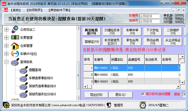 8.到期提醒:车辆投保提醒,车辆年审提醒,车辆二级维护提醒,车辆运输证年审提醒,车辆报废提醒,车辆计价器检验提醒,车辆气瓶检验提醒,驾驶证提醒,驾驶员承租合同提醒,公司证件年审提醒,配件库存警报