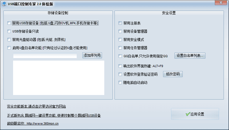 USB端口控制专家是一款USB控制软件,它可以保障机密数据、档案资料和商业信息不被USB移动存储设备非法窃取,它占用系统资源少等众多功能。
