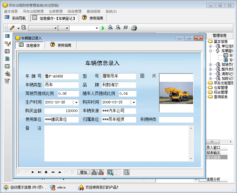 吊车出租财务管理系统是一款针对用于吊车出租公司使用的车辆财务管理软件。它也可以方便快捷的查询吊车的信息。各种操作既可以通过菜单进行,又可以通过系统的管理树导航进行。信息录入智能化,极大提高工作效率。操作快捷、方便,性能高效、强大;使用易懂、易会。丰富多彩的特色令您惊喜。系统在功能方面主要包括:车辆管理、驾驶员管理、吊车出车记录、收益管理、工资提成管理、车辆赢利查询、欠款汇总查询。其他功能:维修、投保、缴费、年审、事故、违章、投诉、费用支出、其他收入、油耗、轮胎等功能。