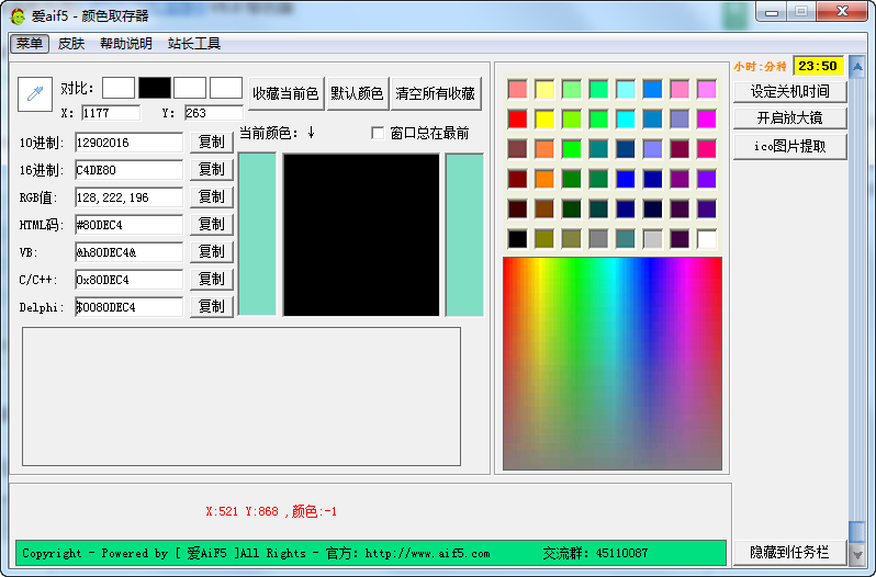 爱aif5颜色取存器能够帮助你快速的在屏幕上吸取颜色,并自动转换为7种不同的颜色对应代码,比如VB、RGB值等相应代码。这款软件还拥有屏幕放大器,定时关机等辅助功能,是美工或者程序员必备的屏幕拾色器。