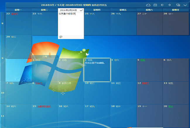 桌面日历(desktopcal)是一款非常方便,非常实用的桌面小工具。桌面日历能帮您轻松管理约会、待办事项、日程安排 ... 不仅如此,桌面日历还提供万年农历、24节气与各种常见的节庆、纪念日等信息。现在就下载吧,桌面日历永久免费。